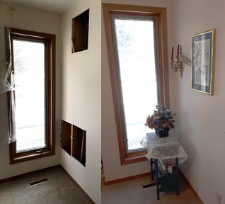 Our repairs and repainting took five days, as we needed multiple coats of paint. Fortunately, we had kept the original indoor house paint and most of it was, amazingly, still good.